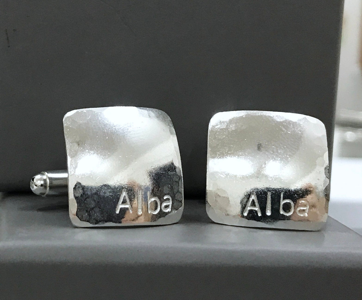 Sterling silver 'alba' cufflinks. Handmade in Scotland. Alba is gaelic for Scotland so these would make a great gift for a scottish dad or grandad abroad - remind him of his roots! Also these have been purchased as best man gifts for weddings. These cufflinks can be personalised with any initials (max. 5 letters) and will be in lower case font unless asked otherwise. Please be aware all personalised pairs will be double checked and the customer contacted before dispatch. Personalised products cannot be refunded.